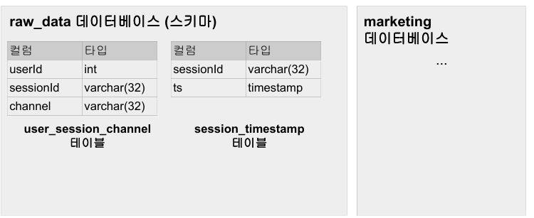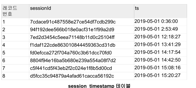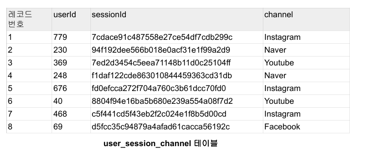 마케팅에 관련된 테이블: 사용자 ID, 세션 ID