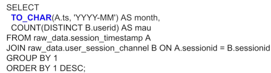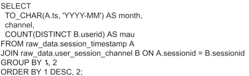 월별 유니크한 사용자수(MAU) - 한사용자는 한번만 카운트 되어야함