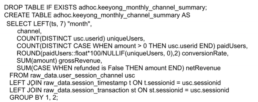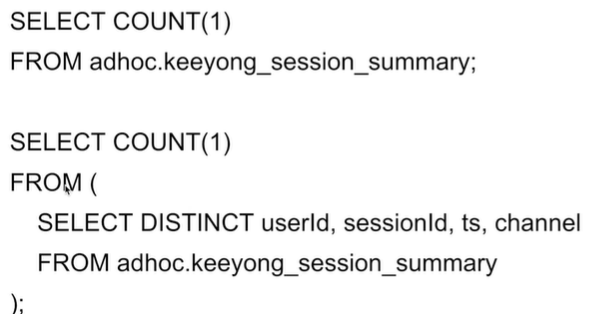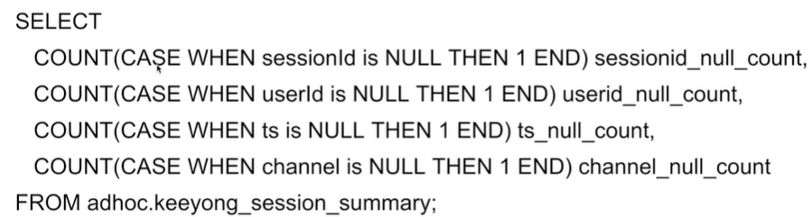 - JOIN시 JOIN 전략부터! session_transaction의 경우 모든 sessionid가 존재하지 않음 -> LEFT JOIN