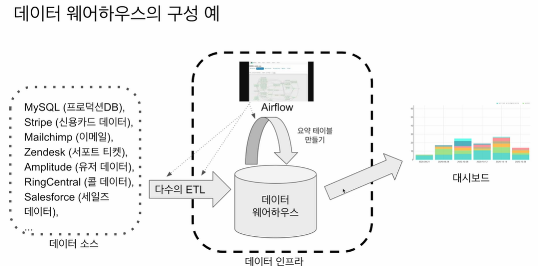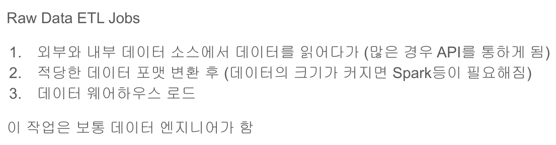이 때 다양한 종류의 파이프라인이 실행된다. 이러한 데이터 파이프라인을 정해진 시간에 실행해주거나 A파이프라인이 끝나면 B파이프라인 trigger해주고 그과정에서 에러가 생기면 담당자한테 alert을 보낸다. -> Airflow