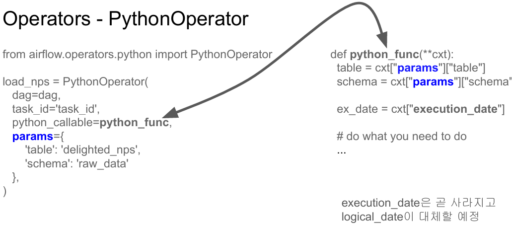 - 또한 함수의 인자들이 PythonOperator에서 필요한 인자가 **context가 아니라 그냥 평범한 인자들이다.
