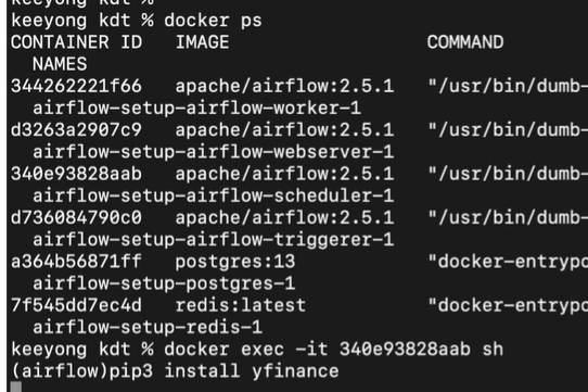 yfinance를 파이썬 모듈을 이용하기 docker에 로그인해서 모듈을 설치해야한다.