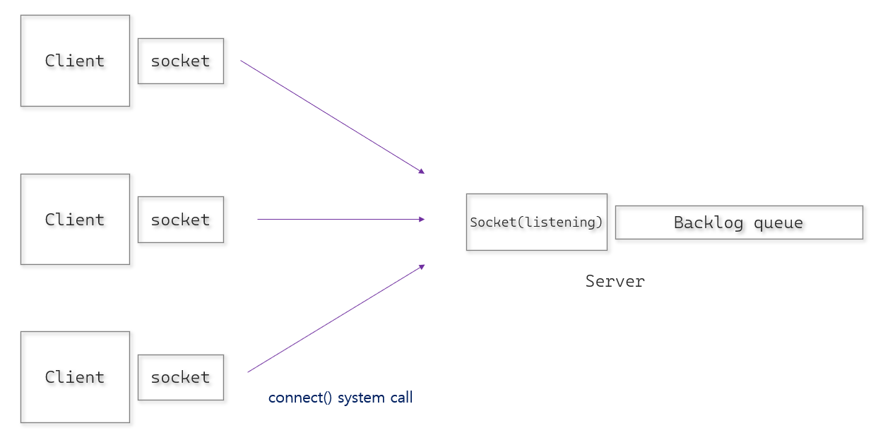 backlog queue를 가진 채로 기다리게 된다. 실제로는 서버에 셀 수 없이 많은 클라이언트가 요청을 보내게 되고