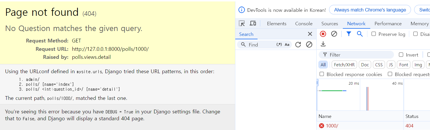 이때 장고 서버에서는 500코드를 내려주게 되는데 이것을 설명할 수 있는 404 에러로 바꿔주자.