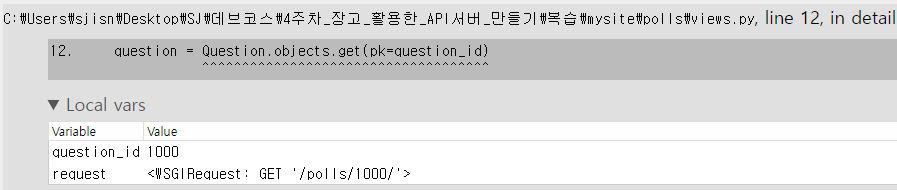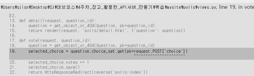 return render(request, 'polls/detail.html', {'question': question, 'error_message': f"선택이 없습니다. id={request.POST['choice']}"})